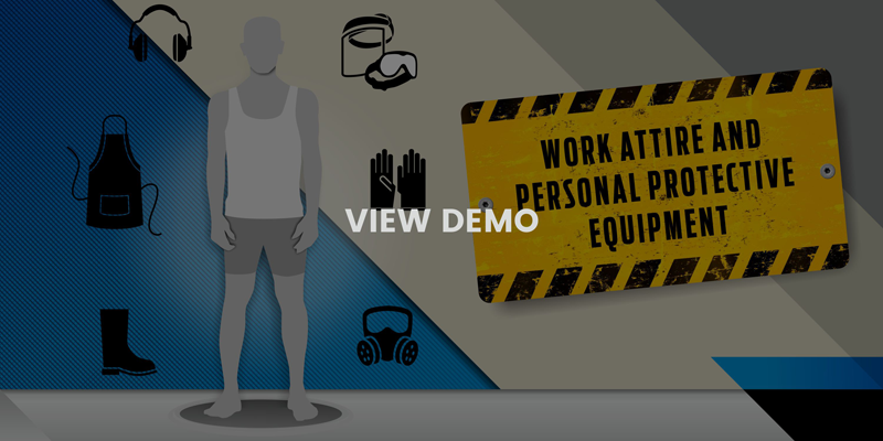 Exploratory interactions are used to present information on appropriate work attire: users attempt to dress for work by selecting attire items from a range of examples and receive corrective feedback when they err. Learners practice awareness of wearing appropriate PPE when exposed to hazards as indicated by safety signs. The interactions sensitize the learner to incorrect choice of PPE and the resulting exposure to occupational hazards.